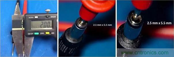 這個技巧有點小竅門。大多數測試探針你會發現其直徑都是2mm的,這也就意味著,2.1mm和2.5mm內徑的接頭都可以插進去。所以,就需要觀察一下探針和孔洞內壁間是否有明顯縫隙。測試探針插入2.1mm接頭時孔洞內壁和測試表筆頭間無明顯間隙,但2.5mm接頭和測試筆頭就有明顯縫隙。