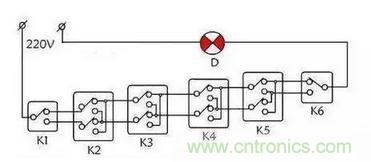 這樣的線路在電梯中常用,當然有時臥室改的細致一點,床左右都加上開關(guān),門口再一個,也是單聯(lián)三控線路了。