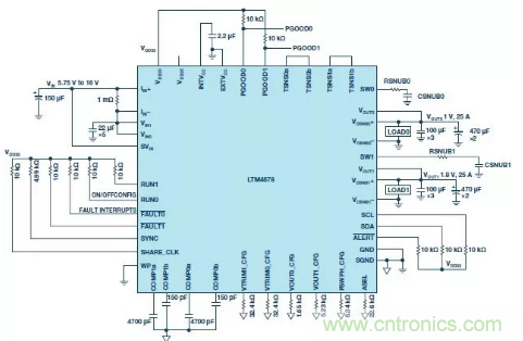 圖7:利用四個LTM4677模塊并聯的應用電路圖,可提供高達144A的電流