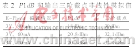 對于非線性模擬,常以諧波平衡模擬(HB)來實現。非線性模擬方法HB計算速度快,能夠處理分布元件和分立元件的電路,并很容易與更高階諧波及互調元件相容。ATF-54143管的P1dB和OIP3模擬非線性模型是基于W.R.Curtice模型,這個模型可以非常近似地模擬直流和小信號工作狀態(包括噪聲),對于截點的模擬則做出模擬預測結果比實際值要偏低。P1dB和OIP3的值如表2 所示:當平衡LNA放大器的OIP3模擬結果為32.1dBm時,P1dB則為20.8dBm,P1dB的模擬結果與實際的測量結果很接近,而OIP3的模擬結果則偏低,實際的測量結果達到37dBm。