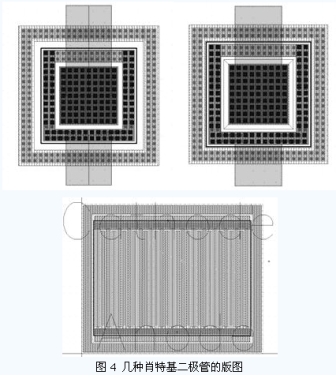 圖4 所示是在UMC 0.18um CMOS 工藝下設計的幾種肖特基二極管的版圖。它們的直流特性測試曲線如圖5 所示。從直流特性的測試結果