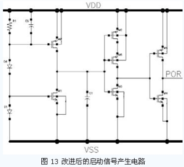 通常,無源RFID 標簽進入場區后,電源電壓上升的時間并不確定,有可能很長。這就要求設計的啟動信號產生電路產生啟動信號的時刻與電源電壓相關。圖12 所示是一種常見的啟動信號產生電路。