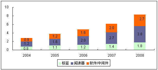 RFID在中國起步較晚,但受益于中國二代身份證市場的強勁需求,市場出現了短期大規模的井噴增長。2004~2007年,中國RFID整體市場規模急速增長,到2008年隨著中國二代身份證市場的成熟,中國RFID整體市場銷售額出現下滑。