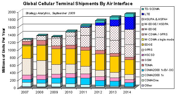 GaAs功放在無線手機射頻前端應用中一直保持較高的使用率,盡管有CMOS功放虎視眈眈,但在3G領域,GaAs以其高線性度、高效率的特性處于絕對的市場領先地位,而CMOS功放由于性能、功耗等因素影響,只能用于短距離、低功率的領域,比如WLAN、PHS等。隨著3G的演進,GaAs的市場空間將穩步上升,下圖為市場調研公司提供的全球手機終端出貨情況。