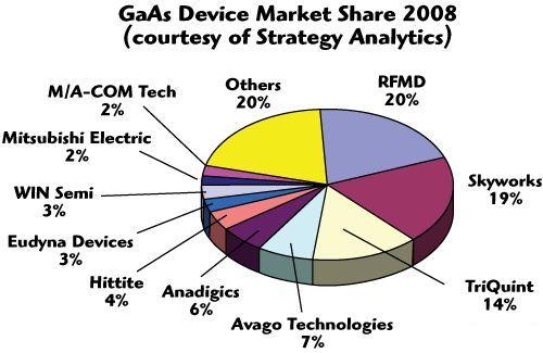 經過多年的發展,GaAs供應商已經形成了穩定的市場格局,由于GaAs產品與工藝關系非常大,大部分廠商都有自己的工廠。下圖是經濟危機開始時2008年GaAs市場占有率情況。