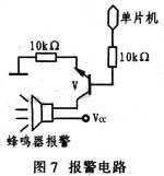 顯示電路采用4位共陽LED數碼管,碼段由74LS244驅動電路驅動;驅動電路由PNP晶體管8550驅動。圖7給出報警電路。它采用晶體管驅動。