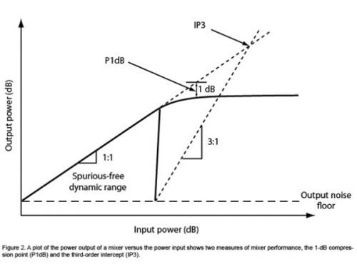 由于未能達到實際的IP3點,因此IP3點是從IMD3獲得的理論值。混頻器的輸出級在達到IP3之前飽和。一般對于無源混頻器而言,高頻信號的IP3至少為P1dB以上15 dB,低頻信號的IP3至少為壓縮點以上10dB。