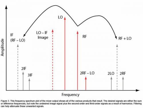 圖3:混頻器輸出的頻譜圖顯示產(chǎn)生的所有不同產(chǎn)物。需要的信號為和頻或差頻,不過請注意,有害鏡像信號和二階和三階信號為諧波的結(jié)果。濾波有助于減少這些有害信號。
