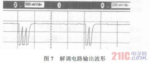 讀寫器發送1s脈寬的OOK調制信號。解調電路輸出波形如圖7所示。下脈沖上升時間較長是由于示波器探頭引入的16pF電容所致。