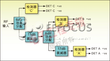 對于檢測器A的路徑,有40dB的衰減;如果輸入功率在+20dBm到-3.5dBm的范圍內,就要選擇該檢測器。因此,在二極管上的信號電平的變化范圍從-20dBm到-43.5dBm。檢測器B具有23dB的衰減,如果輸入功率的范圍在-3.5dBm到-23.5dBm之間,就要選擇該檢測器。在二極管上的信號電平的變化范圍從-26.5dBm到46.5dBm。
