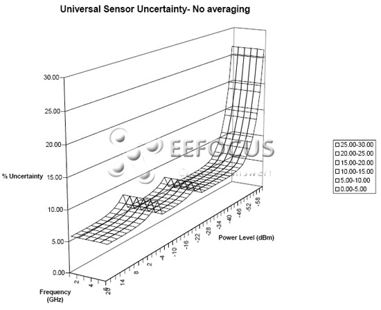 該圖顯示了熱電堆傳感器在其整個工作頻率范圍內的不確定性表面。在該情形下,信號源匹配一直固定在1.2,所以由于不匹配引起的不確定性被減小了。不確定性已經被當作RSS項疊加。在低功率電平上不確定性的增加主要是由零位調整參數引起的。這種與頻率相關的紋波是因在整個范圍內變化的校正因子的不確定性引起的。