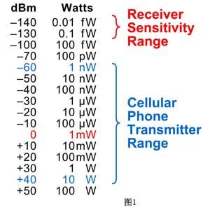 分貝dB是一個(gè)相對(duì)的值。另一個(gè)相關(guān)的單位是毫瓦分貝dBm,它是相對(duì)于1mW的絕對(duì)功率。圖1給出了dBm的值及其相應(yīng)的瓦特?cái)?shù),其中還給出了移動(dòng)電話的發(fā)射機(jī)發(fā)射功率參考范圍,以及靈敏接收機(jī)所能檢測到的最低信號(hào)功率。圖2給出的等式定義了室溫下射頻信號(hào)的理論熱噪聲。由于射頻信號(hào)通過空氣的傳輸以及受到大氣干擾和其它信號(hào)的干擾,到達(dá)接收機(jī)端的信號(hào)電平可能變得非常低。接收機(jī)常常需要檢測低于0.1pW的信號(hào)(或者低于微伏的信號(hào)電平)。