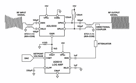 圖1:ADL5330與AD8318配合在自動(dòng)增益控制環(huán)路中工作