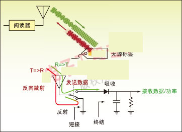 圖1:無源標簽對射頻 RF能量進行整流并調制信號,然后反向散射反射給閱讀器。