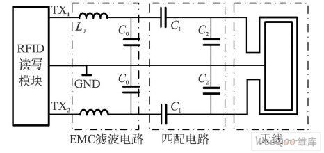 (1)電磁兼容( EMC)濾波(L0 , C0 )電路;(2)包含可調諧電容C1、C2 的匹配電路;(3)天線。