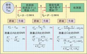 比較方程4~6中圖3的關系與方程10~12中圖4的關系可發現,前者隨著從A點移動到C點,信噪比的下降反映了實際測量結果。另一方面,后者從A''點到C''點,系統Pr/N0比保持固定,反映了一個在接收系統中各個選擇點產生系統(預檢波)信噪比的模型。這種模擬的預檢波SNR可表述在接收系統中的任何參考點處。在模型中,即使信號功率和系統溫度在接收系統中的各個位置互不相同,系統中任何選定參考點處的系統Pr/N0比(其中N0 = kTS)仍然是相同的。