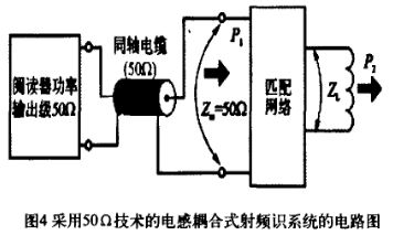 本文研究的RFID讀寫器頻率為13.56 MHz,為有效抑制功率反射、寄生輻射等高頻效應,通常是將讀寫器天線通過同軸電纜連接到讀寫器的高頻模塊,同軸電纜阻抗為50 Ω。因此,天線的阻抗匹配就是通過一定的無源匹配電路來改變讀寫器天線的輸入阻抗,使其與同軸電纜的阻抗保持一致,這樣就可使能量通過同軸電纜幾乎無損失的從讀寫器傳送出去。圖4為采用50 Ω技術的電感耦合式射頻識別系統電路。
