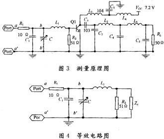 下面僅說明測量射頻功率管2SC1971的輸入阻抗的具體過程,輸出阻抗的測量方法與此相似。圖3是測量2SC1971的輸入阻抗的原理圖,圖4是他的等效電路圖。R1的值設(shè)計為10 Ω左右,以減少輸入的功率,同時HA由R1組成比較簡單,便于計算,HB由L1,C1,R2組成,同時也是功率管的匹配和偏置網(wǎng)絡(luò)。HA,HB也可以由多級L型或Ⅱ型雙口網(wǎng)絡(luò)組成,只是計算量增大。經(jīng)過實測采用單級L型網(wǎng)絡(luò)在bb′處測得的波形比較接近正弦波,測量出的結(jié)果誤差不大。