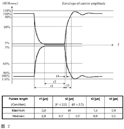 由于NFC106kbps為100%ASK調(diào)變,所以對整個High/Low信號的封包結(jié)構(gòu)都有相當詳細的定義。其中幾個參數(shù)包括從100%下降到5%Am時間(t1)、5%Am持續(xù)時間(t2)、Am由5%上升至60%時間(t4)即overshoot的范圍。而212/424kbps則是8%~30%的調(diào)變率。