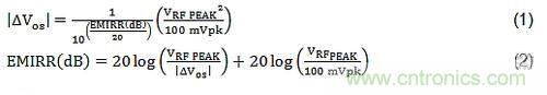 方程式(1)和(2)給出了EMIRR的數學定義。兩個方程式互為彼此的重置版本。方程式(1)展示了所用RF信號和偏移電壓的改變之間的關系。請注意所用RF信號的平方引起的偏移電壓變化。這意味著入射RF信號較小幅度的增加可導致偏移電壓的顯著增加。還請注意,術語EMIRR的作用是減弱RF信號的影響;換句話說,較大的EMIRR(dB)可使偏移電壓的變化大幅度減少。方程式(2)是在表征過程中用來計算EMIRR(dB)的方程形式。