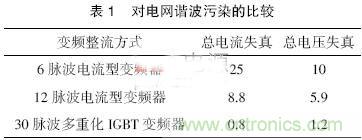 為了將諧波產生的種種干擾防患于未然,應該在發生源(變頻器)側抵制高次諧波。首先主電路可選擇采用多脈沖數整流、多電平輸出形式,諧波少對電網的污染也小,如表1 所列。從表中看出主電路整流脈波數多三電平輸出可達到高標準的要求。還可采用動態消除諧波的方法,當然成本就會增加,但要比較權衡。