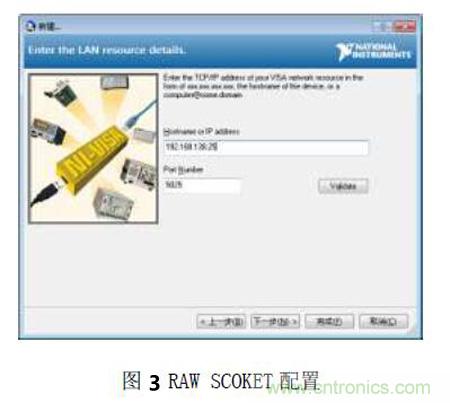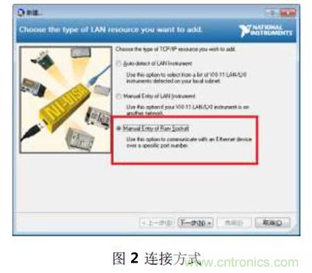 啟動(dòng)Masurement & Automation Explorer 軟件,選擇設(shè)備和接口,在添加網(wǎng)絡(luò)設(shè)備中,使用Manual Entry of Raw Scoket(手動(dòng)輸入原始SOCKET)方式連接,ZDS2024 示波器采用端口號(hào)5025 來(lái)接收SCPI 命令。如圖2和圖3所示。設(shè)置好后,可進(jìn)行測(cè)試,確保連接成功。