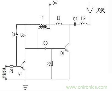 Q2是緩沖放大級,Q1的輸出經(jīng)C3耦合到Q2(圖中右邊的“Q1”)基極,L1是Q2的負(fù)載電感;并經(jīng)C4/L2串聯(lián)諧振電路送到天線發(fā)射。R2接地,也就是零偏置,由于輸入信號幅度較大,且是以C4/L2諧振回路來選頻的,所以不怕失真,這樣效率較高。