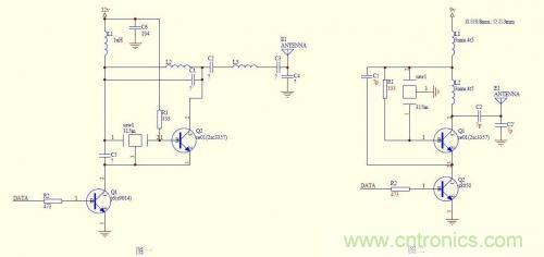 兩電路基本原理一致,都是由0、1信號控制實(shí)現(xiàn)高頻脈沖發(fā)射的電路,工作頻率由晶振決定,從穩(wěn)定性上分不出優(yōu)劣。圖二電路簡潔,稍容易調(diào)試些,圖一在三極管集電極與電源間加了選頻網(wǎng)絡(luò),在三極管集電極與天線之間也加了選頻網(wǎng)絡(luò),輸出頻率更純凈,但調(diào)試要麻煩些。再一點(diǎn)區(qū)別是圖二上方三極管的基極通過電阻引入了交流負(fù)反饋,其實(shí)這對該電路穩(wěn)定性的影響也并不明顯。電源上對地的高頻電容還是保留為好,但圖二中沒有畫出。