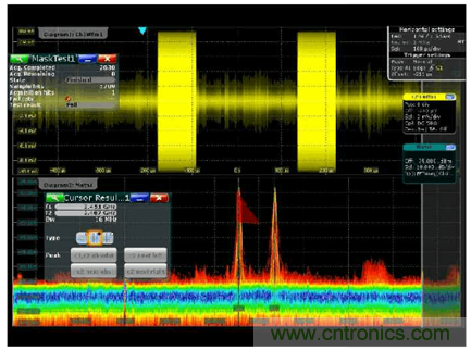 很多用慣了示波器的人都喜歡示波器的觸發(fā)功能,用各種觸發(fā)方式來隔離各種事件,穩(wěn)定顯示,觀察異常。在傳統(tǒng)頻譜儀上是很難實(shí)現(xiàn)觸發(fā)的,但是當(dāng)我們發(fā)現(xiàn)示波器的模板觸發(fā)方式,很容做到,把時(shí)域波形的實(shí)時(shí)頻譜變到頻域來觀察,借助MASK 測試的一些小工具,居然輕松設(shè)置和輕松觸發(fā)。因?yàn)槟0宓男螤钭杂删庉嫞|發(fā)的動(dòng)作自由組合,這樣的波形分析已經(jīng)完全跨越的時(shí)域和頻域的使用習(xí)慣,完全融合了時(shí)域和頻域?qū)π盘柕乃季S方法了。