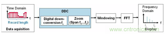 傳統(tǒng)的做法是,示波器把信號樣本采集下來,然后通過軟件算法來進(jìn)行軟件運(yùn)算,速度非常慢,我們的方式通過專用的硬件加速集成電路(ASIC),把fft 功能交給這個(gè)硬件電路來實(shí)現(xiàn),速度快到幾乎不影響原始波形的刷新速率。當(dāng)然這個(gè)ASI 是需要花大把銀子來研發(fā)的。核心對比用到了專用的DDC 電路。