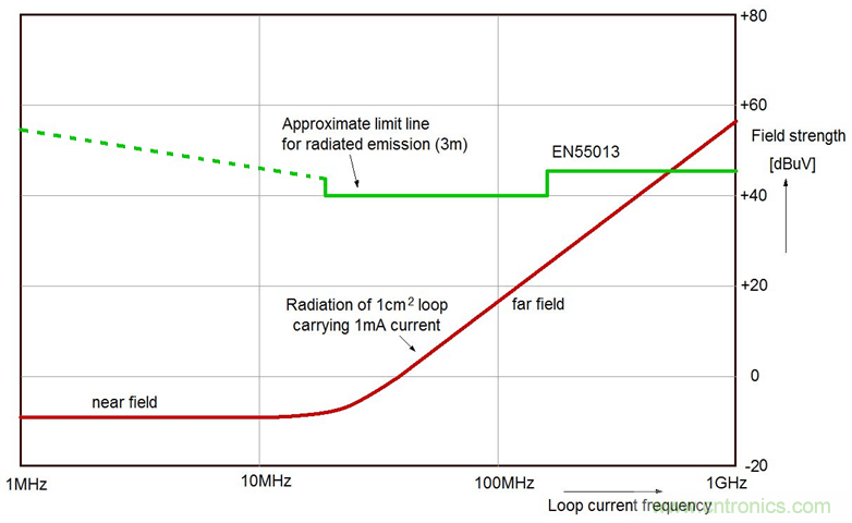 舉例而言,一個1cm²的電流環,其中的電流為1mA,電流變化頻率為100MHz,則距離此電流環3m處的場強為4.4µV/m,或說是12.9dBµV。
