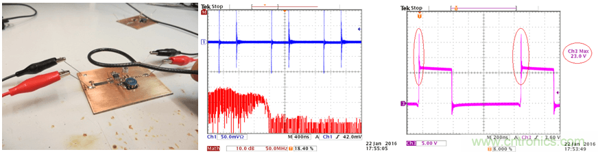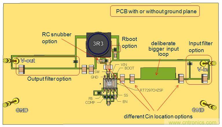 在此實驗中,我們使用雙面PCB,輸入電容的放置位置如上面的實驗2一樣,這樣的配置可以在輸入回路中引入比較明顯的輻射。