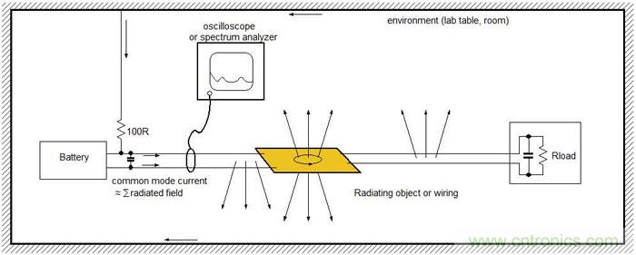 當被測試對象被放在實驗桌上時,其PCB上的電流回路和導線就會向周圍環境輻射出高頻能量,這些輻射信號又會自己找到路徑返回到測試對象上,并以高頻共模電流的形式出現在供電線上。這些供電線上的高頻共模電流會和板上的電流結合在一起,可被用著輻射狀況的指示信號。
