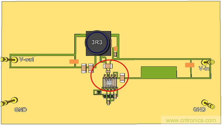 我們繼續使用單面PCB,并將CIN放置到靠近IC的地方,這樣就形成了比較小的CIN回路。參見圖20。