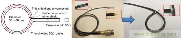 其實我們是有可能在實驗室環境下對產品原型進行一些基本的EMI測試的,還可對系統的各個模塊分別進行。這樣的測試通常屬于近場環境(測量距離 < 0.16λ),因而在測試電流回路的輻射狀況時需要使用小型的環形天線來對高頻磁場進行測量。你可以使用一段50Ω的同軸電纜自己制作小型的擁有電屏蔽的環形天線,這看起來并不是一件很難的事情,可參考圖43的示意進行。