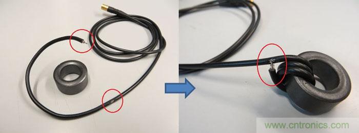 為了將測試工具和測試對象隔離開,最好是在電纜上加一個共模線圈,這可通過將引入分析裝置的電纜多次穿過一個扣合式的EMI鐵芯來實現。