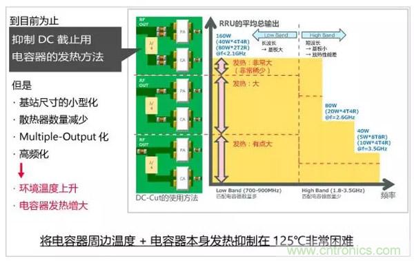 但是,近年來隨著Multiple-Output化(Tx增加)加速,一方面元件數(shù)量增加,而由于基站尺寸小型化,散熱器等散熱對策可用的空間越來越少。使用頻帶的進(jìn)一度高頻化,元件發(fā)熱進(jìn)一步增大,將電容器周邊溫度和自身發(fā)熱抑制在125℃,在電路設(shè)計上的制約案例中變得尤為顯著。