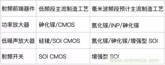 以功率放大器為例,目前主流的功率放大器制造材料為砷化鎵,但在毫米波頻段,氮化鎵及InP的制造工藝在性能指標上均要強于砷化鎵。下表所示為從低頻到毫米波段主要的射頻前端器件制造工藝上的發展方向。