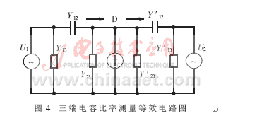 如果將兩個三端電容串接起來,分別用兩個信號源供電,就形成了如圖4所示的等效電路,其中,Y12=jωC12,Y′12=jωC′12。在公共點D與接地端之間連接一個檢流計,調節兩個外加電壓的幅值和相位,使通過兩個直接電容流向D點的電流大小相等、方向相反,直道檢流計指零,便可得到下面的關系式: