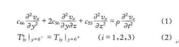 與淺體聲波一樣,表面橫波也是SH型聲表面波,只有平行于晶體表面單一的質(zhì)點(diǎn)振動方向。因此可以假定表面橫波在晶體表面沿著Z方向傳播,質(zhì)點(diǎn)在X方向振動。克里斯托夫方程及晶體表面的邊界條件可表示為