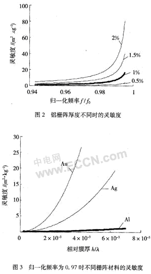 綜上分析,對于STW傳感器,柵陣厚度的增加有利于靈敏度的提高,柵陣厚度越大,靈敏度越高。但是在同一工作頻率下柵陣厚度的增加同時引起損耗的變化,在實際器件設(shè)計時,應(yīng)當(dāng)同時考慮這兩個因素,選擇一個最佳厚度。在柵陣厚度值確定時,IDT的激發(fā)頻率接近阻帶邊緣頻率時能獲得較大的靈敏度。對于柵陣材料的選擇,由以上的分析可知,金獲得靈敏度最大,大于銀的2倍,遠(yuǎn)遠(yuǎn)高于鋁。
