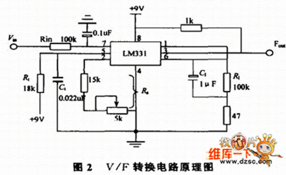 由Fout= Vin•Rs/(2.09•R1•Rt•Ct)可知,電阻Rs、R1、Rt和電容Ct直接影響轉換結果Fout,因此對元件的精度要有一定的要求,可根據轉換精度適當選擇,其中Rt、Ct、Rs、R1要選用低溫漂的穩定元件,Cin可根據需要選擇0.1uF 或1uF 。電容C1對轉換結果雖然沒有直接的影響,但應選擇漏電流小的電容器。電阻R1和電容C1組成低通濾波器,可減少輸入電壓中的干擾脈沖,有利于提高轉換精度。電路中的47Ω 電阻對確保電路線性失真度小于0.03% 是十分必須的。