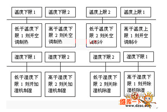 上電初始化,根據板子的撥碼開關的狀態讀取并保存溫濕度儀地址;讀取存在外存中的上次已設置好的溫濕度上下限的歷史值和保存的采樣間隔歷史值。然后,進入主循環中,根據采樣間隔時間,將溫度、濕度、等數據存入外存,點亮LED數碼管顯示當前時間、溫度、濕度,并根據已設置好的溫濕度上下限值來確定是否驅動蜂鳴器報警且控制空調機、加濕機、除濕機工作進行溫濕度控制調節[7](溫濕度上下限控制示意圖見圖3)。系統有良好的交互性能,利用中斷可在線隨時設置時間校正值、溫濕度上下限值、采樣間隔時間值、溫濕度校正值并將這些數據存到外存中;可在線提取當前溫濕度數據和溫濕度儀狀態等數據;可由相應指令提取根據采樣間隔已存在外存中的歷史溫濕度數據。
