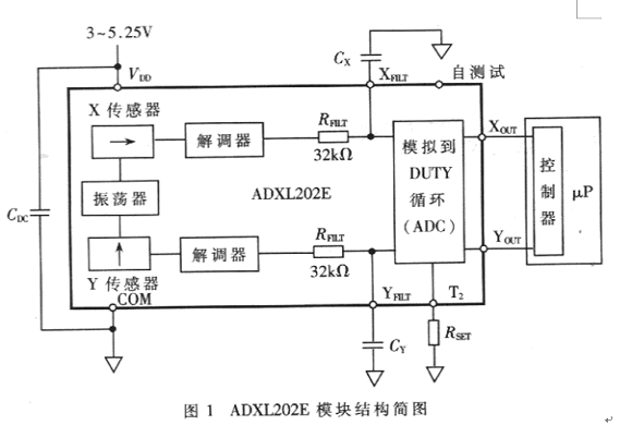 ADXL202的模塊結(jié)構(gòu)如圖l所示,它是在單一芯片上集成兩個(gè)相互獨(dú)立、測(cè)量方向相互垂直的敏感元的測(cè)量模塊,是由多晶硅微加工表面工藝制成的電容式加速度傳感器;由硅片表面的彈性結(jié)構(gòu)支撐起的質(zhì)量塊下面貼附電容的一個(gè)極板,電容的另一極扳固定。當(dāng)加速度引起質(zhì)量塊的相對(duì)位置變化時(shí),電容值也發(fā)生變化;兩個(gè)敏感元的信號(hào)處理電路將各自的電容變化轉(zhuǎn)換成幅值與加速度成正比的方波信號(hào),經(jīng)工作周期調(diào)制(DCM)后,就能將模擬信號(hào)轉(zhuǎn)換為數(shù)字信號(hào),通過引腳XOUTYOUT進(jìn)行輸出。另外,ADXL202還可以通過XFILT、YFILT引腳輸出模擬信號(hào)。