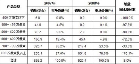 表2 2008年中國數(shù)碼相機市場不同產(chǎn)品像素類型銷量及增長情況