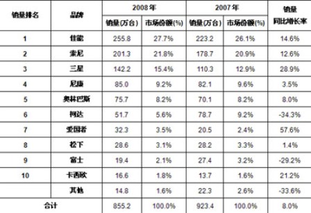 2008年,佳能進一步保持并鞏固其銷售量市場第一的領(lǐng)先地位,市場占比達到27.7%,Sony繼續(xù)保持中國數(shù)碼相機市場的第二名的位置,在其突出的產(chǎn)品攻勢下,市場份額有所上升。三星、尼康和奧林巴斯,分別進入中國數(shù)碼相機市場的前五名。