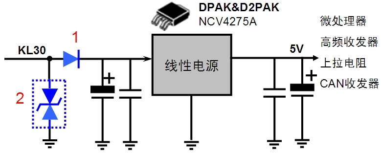 NCV4275A是一款帶復位和延遲功能的5 V、3.3 V/450 mA低壓降(LDO)線性穩壓器,這款器件支持可編程微控制器復位,并提供多種特性,如過流保護、過溫保護、短路保護等。此外,在下圖中位置1處串聯一個二極管(MRA4005),這線性電源能有效防止高達-42 V的反向電壓。