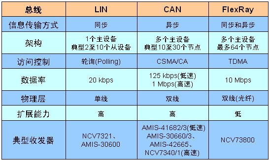 表1:不同汽車總線比較及典型收發器。