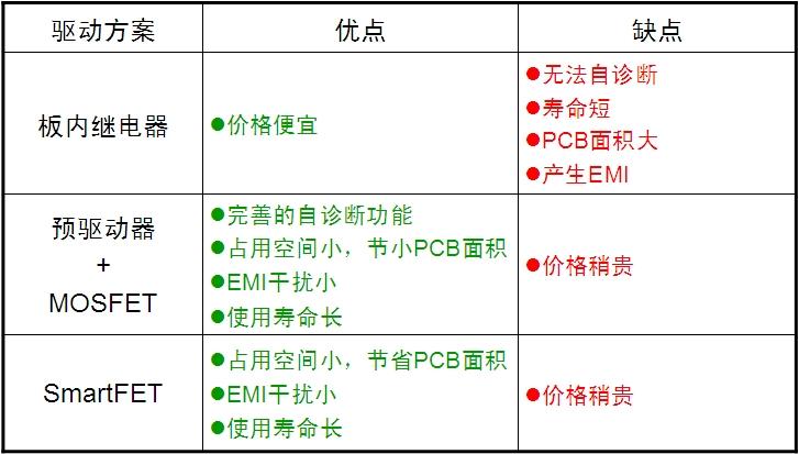 第三種方案是采用SmartFET驅動。這是帶保護的MOSFET,在MOSFET基礎上增加了多種功能,如過壓鉗位、ESD保護、過流保護、過溫保護、反壓保護及高邊和低邊驅動。典型器件如低邊驅動的NCV8401/2/3,及用于高邊驅動(內部集成了升壓電路)的NCV8450和NCV8460等。這三種方案的優缺點見表2。