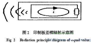 此時為差模輻射。可通過減小環路面積S和環路電流i來減小差模輻射。共模輻射可用對地電壓激勵的、長度小于1/4波長的短單極天線來模擬。共模輻射的電場強度為[3]